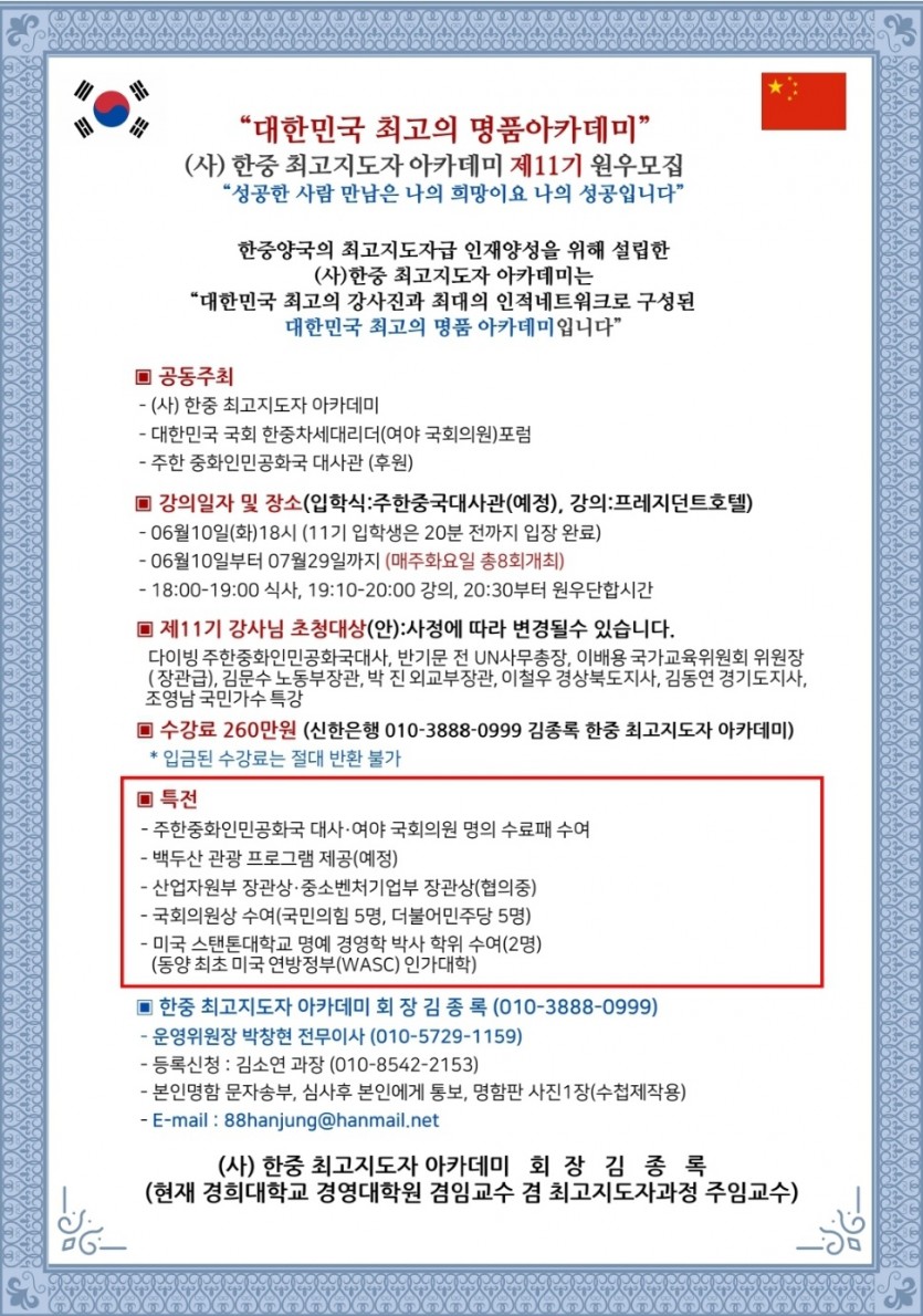 대한민국 최고의 명품아카데미, 한중 최고지도자 아카데미 11기 원우를 모집합니다.
